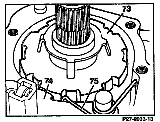 28. In transmissions with pressed-on pulse disc electronic speedometer, take off parking lock gear (73) with rotor, parking pawl (74) and spreader spring (75).