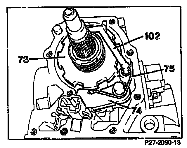 29. In transmissions with mechanical speedometer, take off oil pipe (102), parking lock gear (73) with helical gear, parking pawl (74) and spreader spring (75).