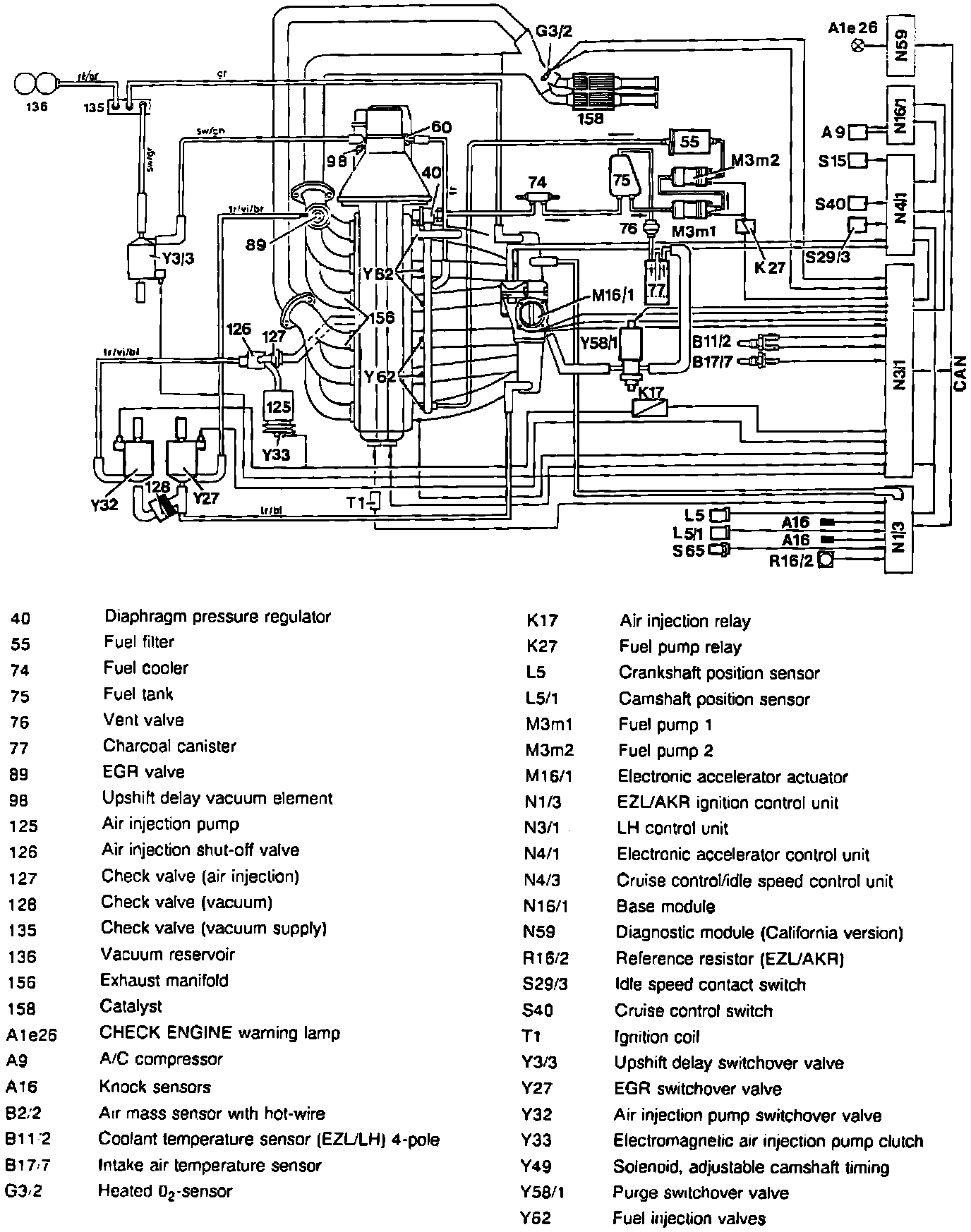 If the diagnostic module detects a serious fault in the engine control system, it activates the "CHECK ENGINE" light. By extracting the fault codes using diagnostic socket X11/4 or s1, you can determine what component or components need further testing or replacement.