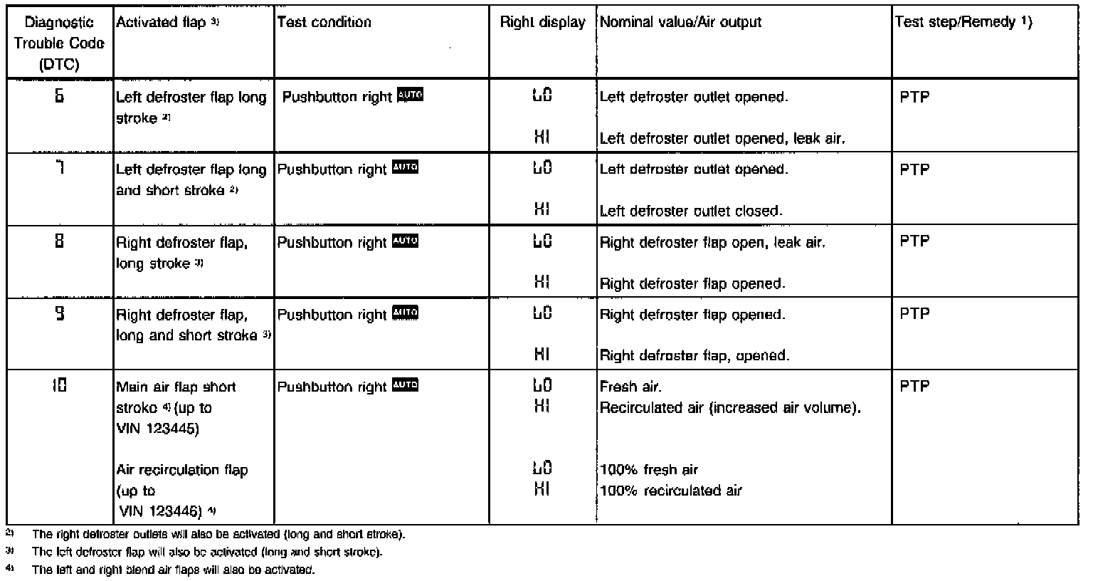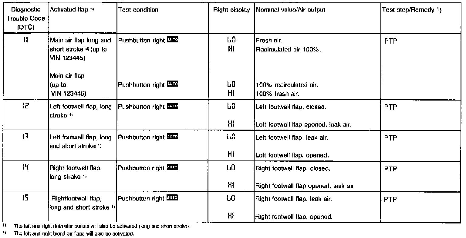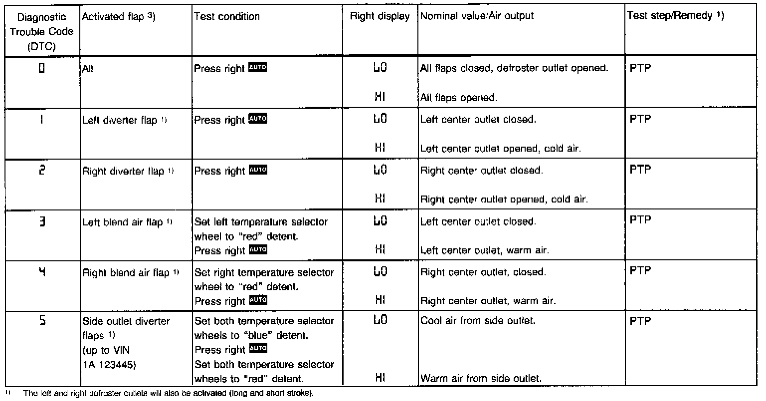 DIAGNOSIS - INDIVIDUAL FLAP TEST (via A/C Pushbutton Control Module N22).- The display window in the A/C pushbutton control module (N22) will show the test step. Pressing the various buttons will activate the individual vacuum actuators. The LED on the depressed button lights up.
