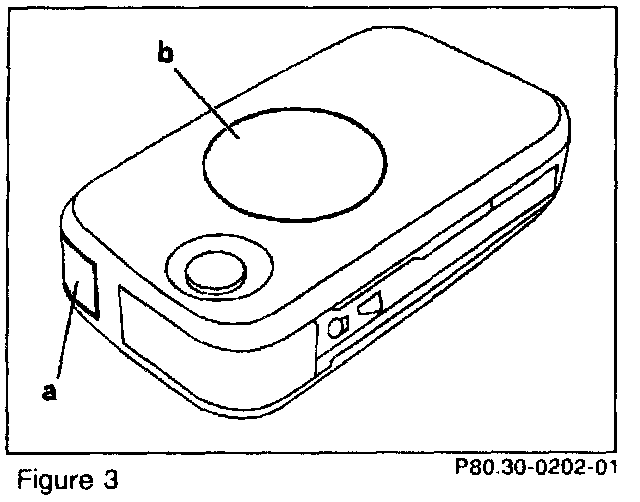 1. Aim infrared (IR) transmitter sender window (a) at a receiver and press button (b) momentarily (Figure 3).