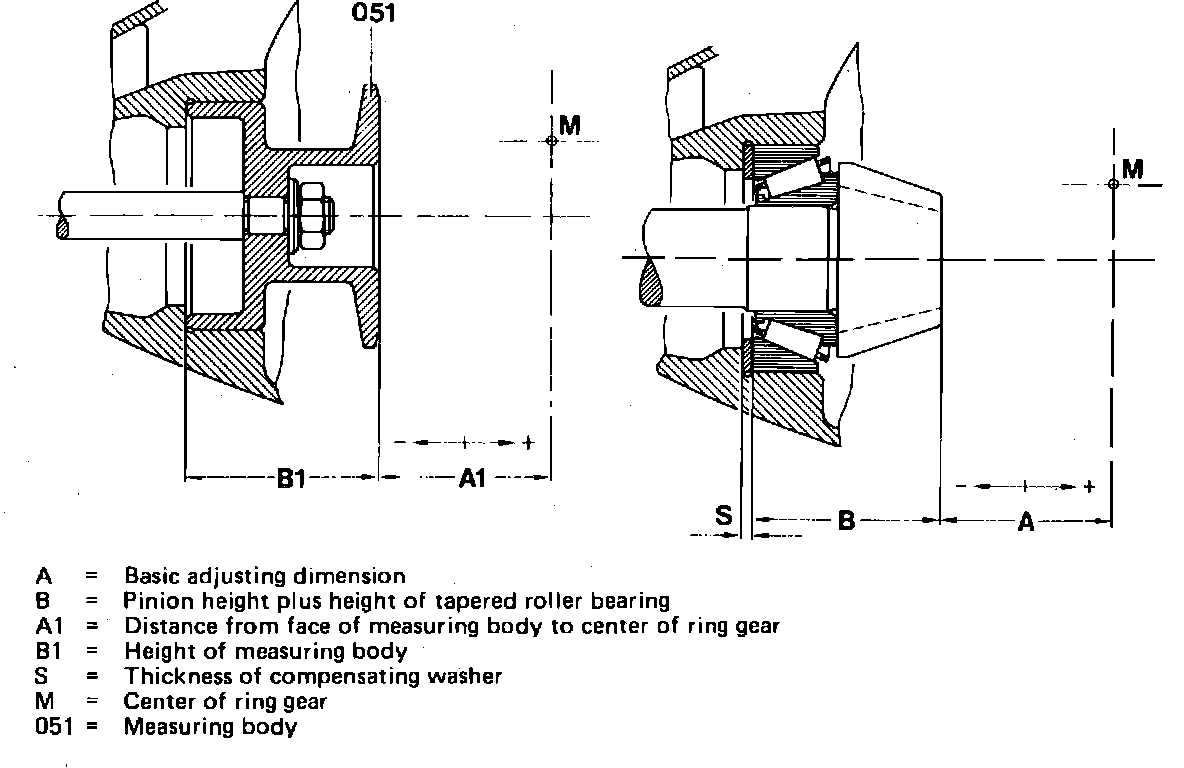 e. Determine compensating washer thickness to be used with a small center piece and a drive pinion height of 1.5 inch (39mm). The difference between measuring body height ``B1,'' Fig. 4 and pinion height with bearing ``B'' is 0.062 inch (1.6mm). Allowable pinion deviation, which is stamped on the pinion is + 0.077 inch (0.20mm).