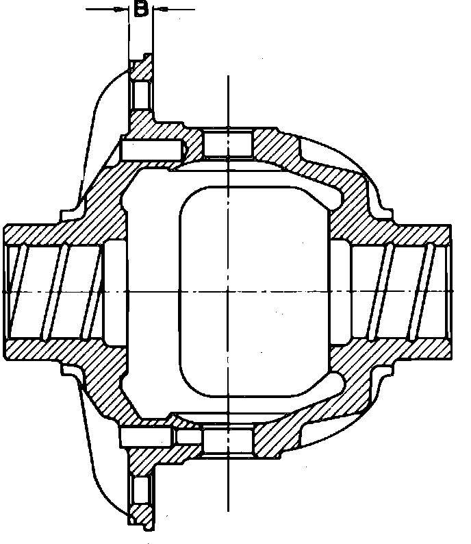 b. Install thrust washers (18), Fig. 6, onto side gears (17). Position both side gears and washers assemblies onto the mandrels and into differential housing (12). The differential ball washers of the present production model ``B,'' are provided with a collar at the outside diameter, Fig. 7, and the differential pinions with a shoulder (arrow).