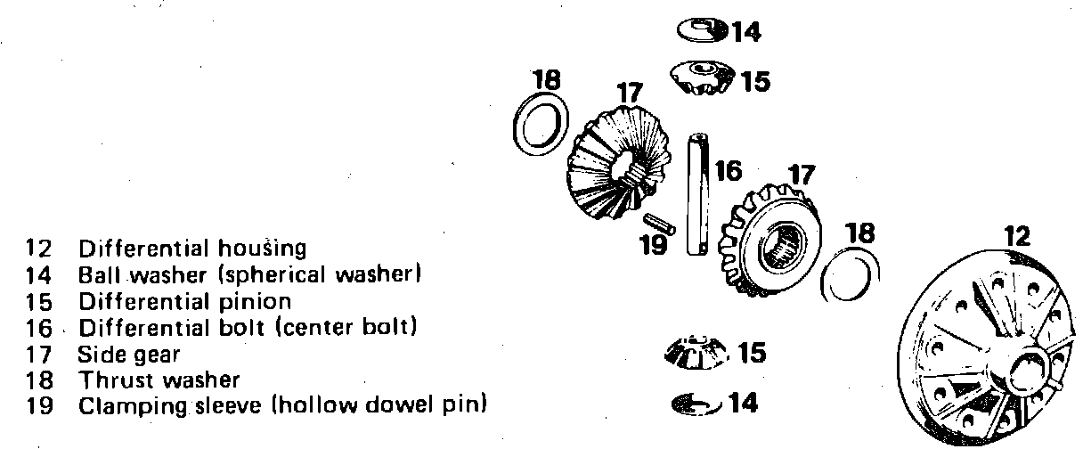 c. Using the mandrels, turn both differential pinions (15) and ball washers (14) into the differential housing (12).