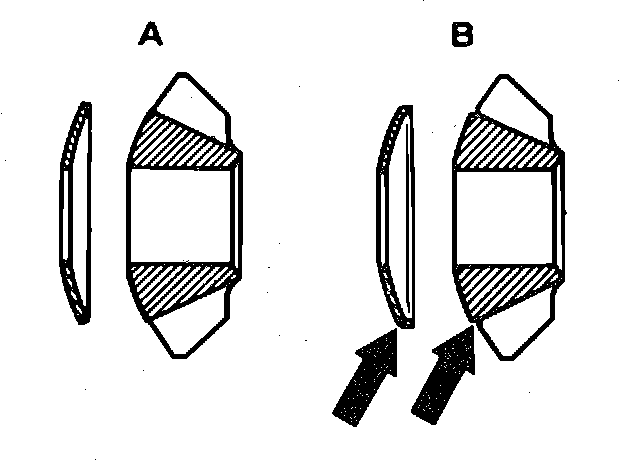b. Insert left hand side gear and friction disc assembly into mandrel, and install into differential housing. Install right hand side gear with friction discs into differential housing. The differential ball washers of the present production model ``B,'' are provided with a collar at the outside diameter, Fig. 7, and the differential pinions with a shoulder (arrow).