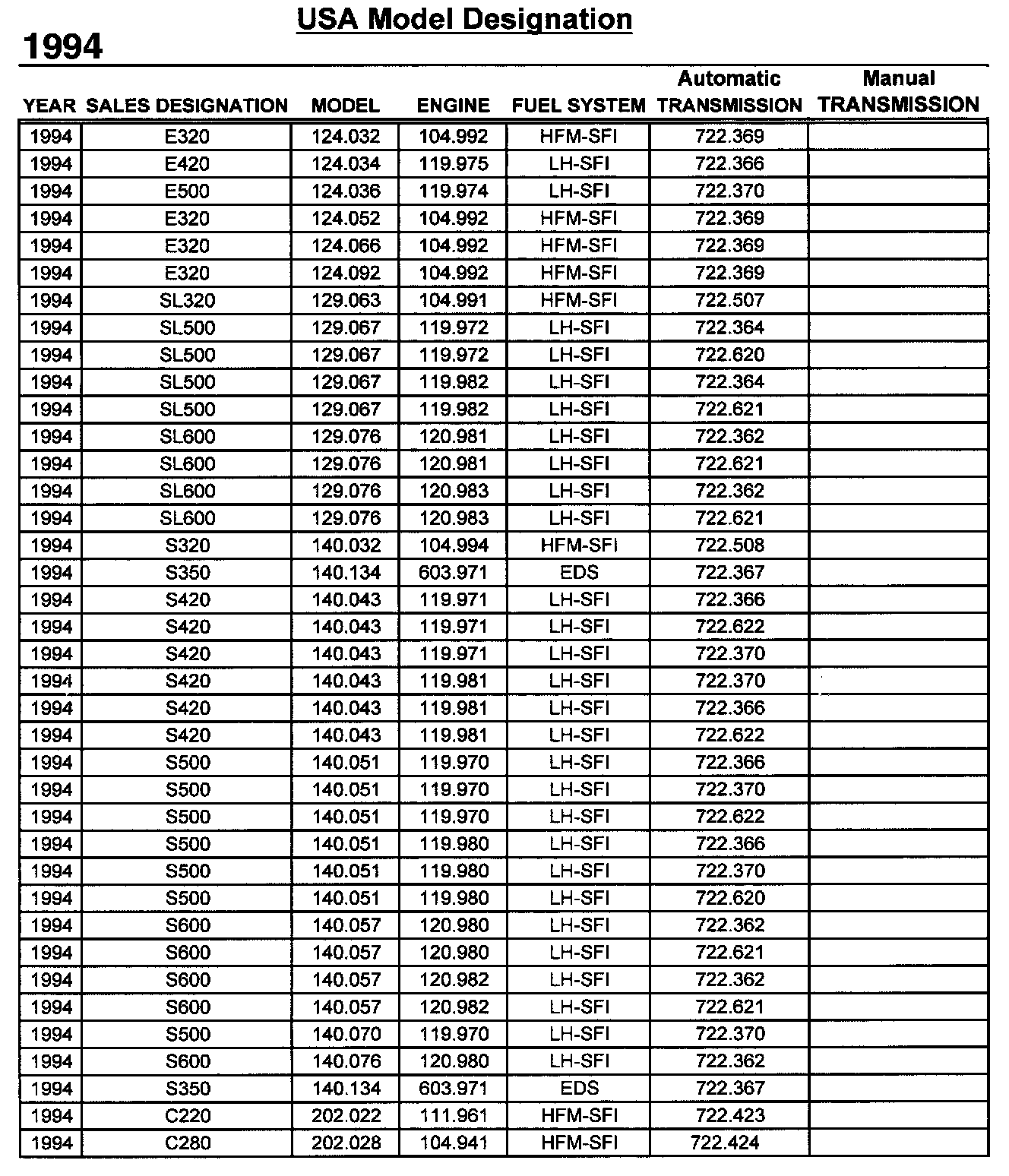 Vehicle Designation Sheet 1994: