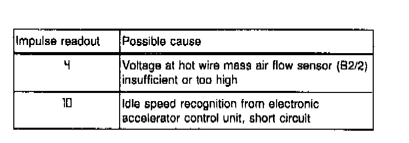3) If the on/off ratio readout is fixed at 50 % with ignition ON, and oscillates with engine at operating temperature and idling, the malfunction memory is in error.