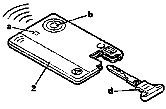 The spare key (2) is the size of a credit card. The spare key can be used for the central locking as well as the ATA. Moreover, the drive authorization system can be activated and deactivated with the infrared remote control signal. Actuation of the convenience feature is not possible. The spare key (2) contains an infrared remote control, a pushbutton (b) for actuation, a LED (a) for checking the battery, a battery compartment with two batteries and a mechanical main key (d). The infrared beam exits from the middle of the front side of the spare key when the button (b) is pressed.