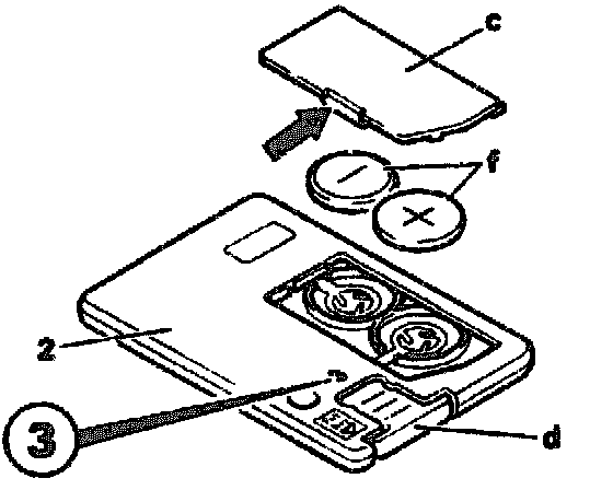 To replace the two batteries (f), remove the battery compartment cover (c) on the spare key (2). For this purpose press in the catch (arrow). The same batteries are used as in the standard infrared remote control.