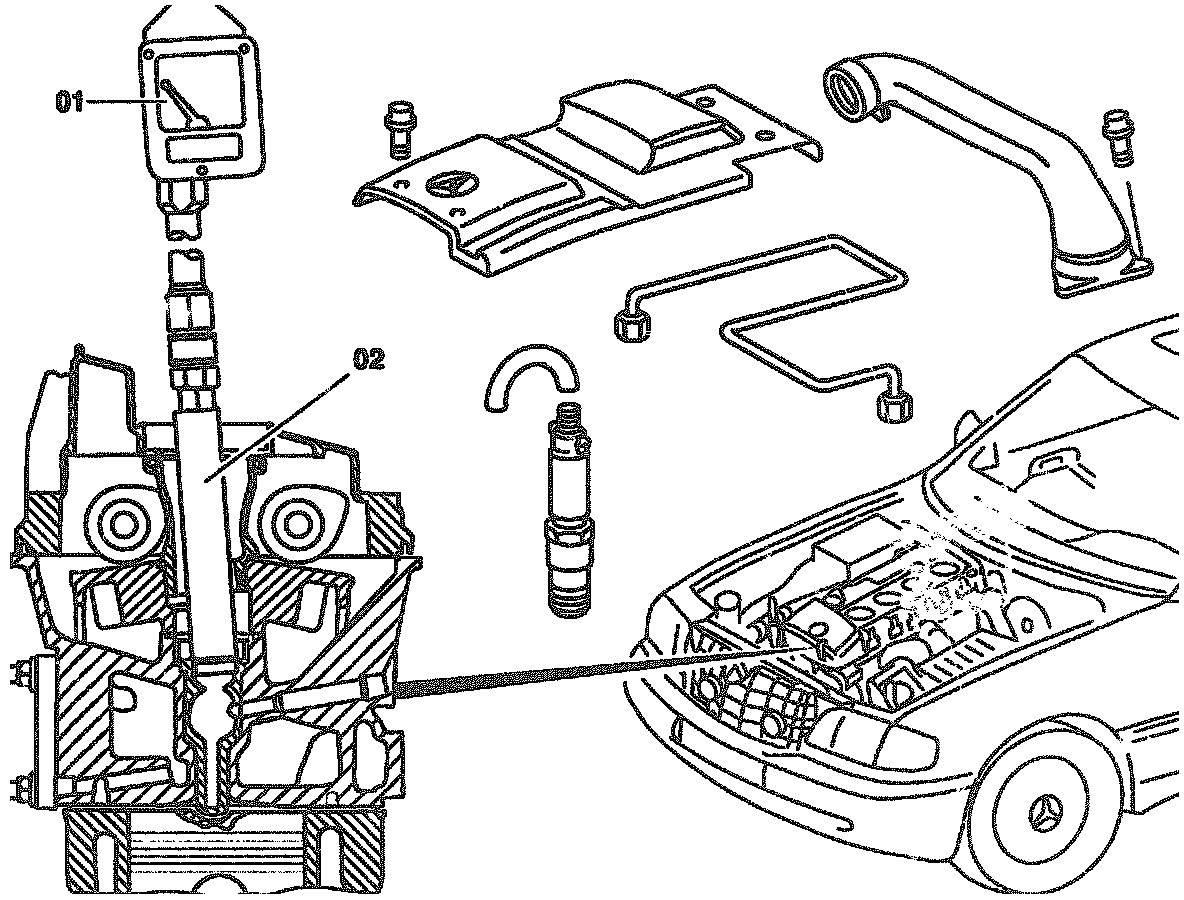 4. Screw Compression tester (01) with connector (02) into the prechamber of the cylinder to be tested