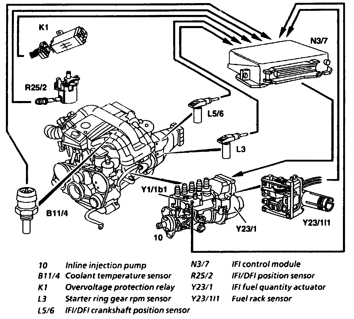 The IFI/DFI crankshaft position sensor (L5/6) supplies an alternating voltage signal to the IFI control module (N3/7). The control module calculates the engine speed conducts a set/actual value comparison and control the specified engine speed through the IFI fuel metering control (Y23/1) and the control rod.