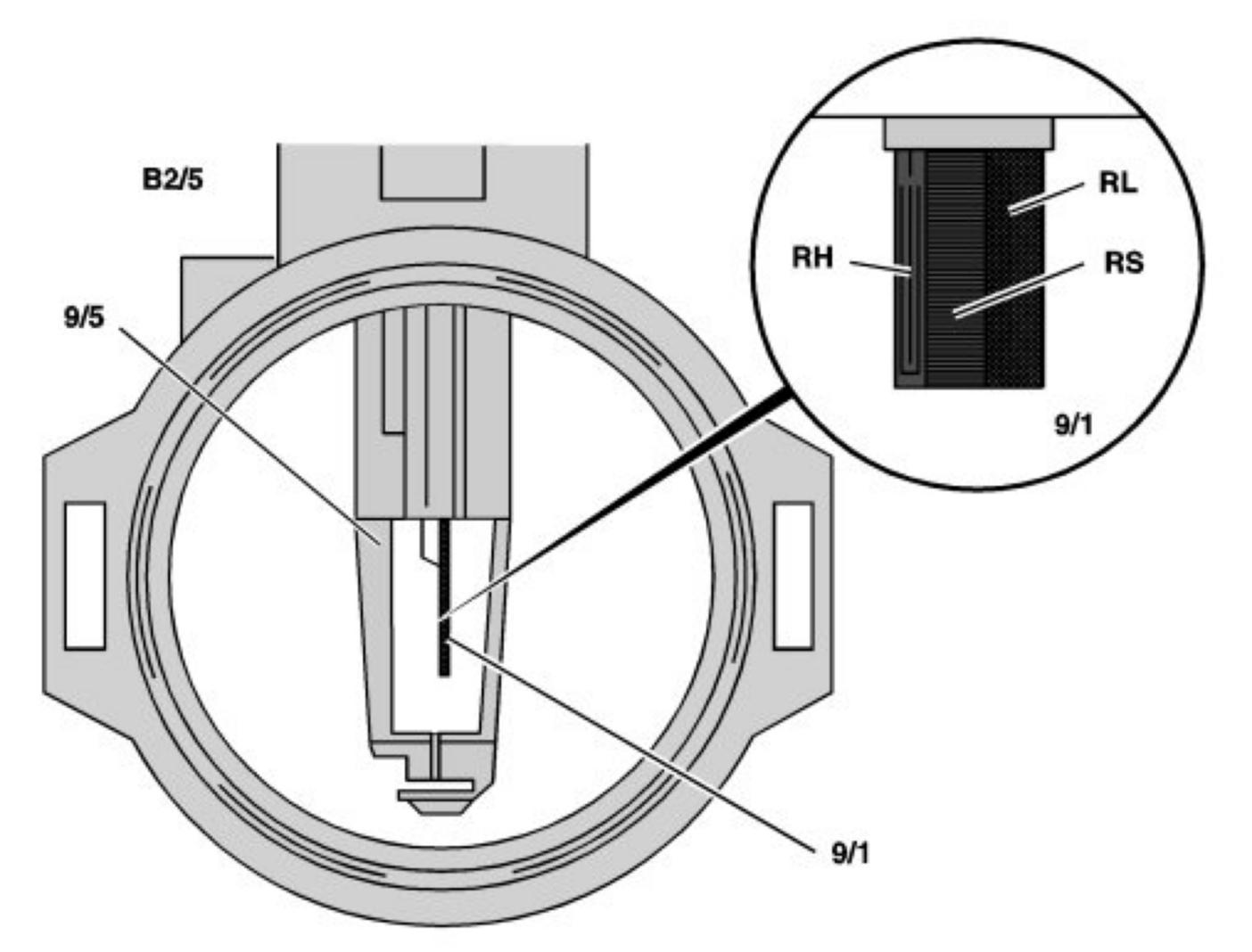 The elecronics in the hot film mass air flow sensor controls the temperature of the heating resistor (RH) by means of a variable voltage so that its temperature is 160°C above the intake air temperature detected by the temperature resistor (RL). The temperature of the heating resistor (RH) is detected by the sensor resistor (RS). If a change in temperature occurs because of an increase or reduction in the air flow, the electronics (9/5) adjusts the voltage of the heating resistor (RH) until the temperature difference is again achieved. This control voltage is used by the engine control unit as a measure for the metered air mass.