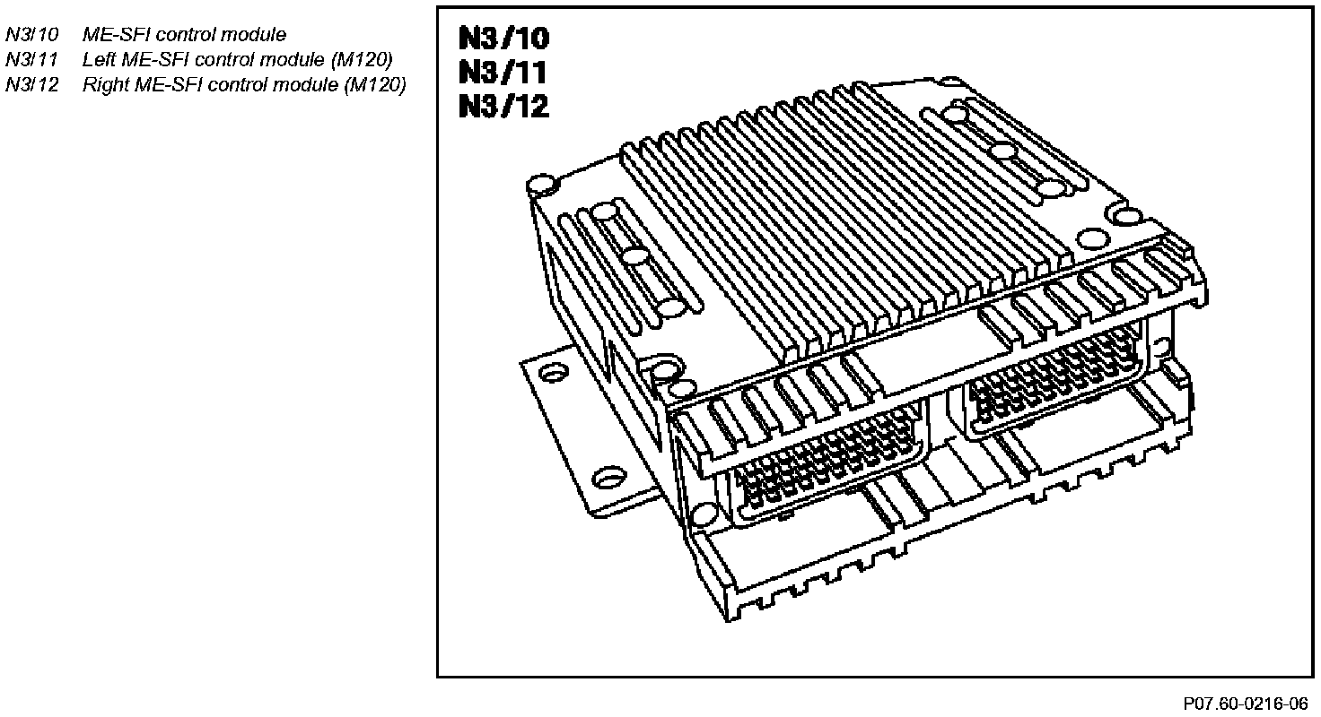 Two control modules are installed in engine 120. The left ME-SFI control module is connected at connector 45 to ground as a distinction.
