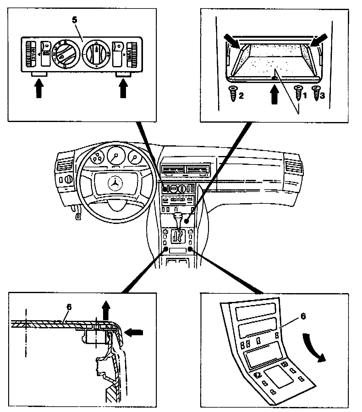 - Bend oddments tray inwards at upper corners (arrows), press forward and remove at corners.