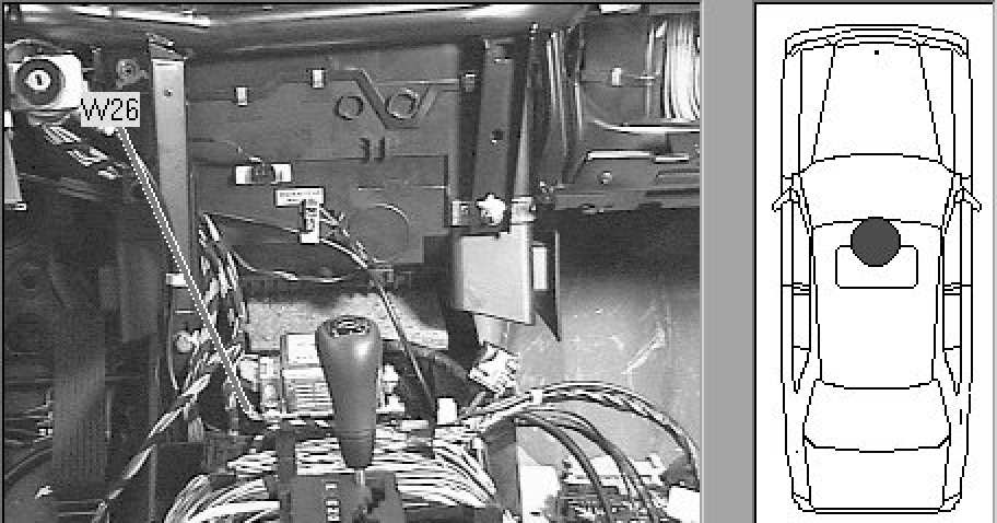 Center console, forward of shifter, beneath mounting lug for N2/2
