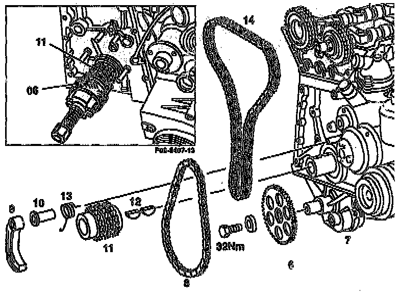 11. Reverse procedure to install, being sure to tighten the oil pump drive gear (6) at oil pump (7) to 32 Nm.