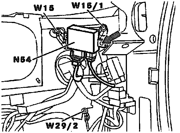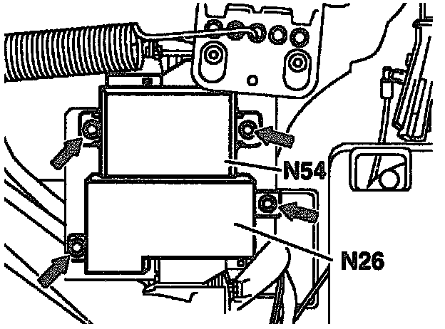 The control module in the sedan is located on the reinforcement on the right of the trunk. The control module in the coupe is positioned below the left rear seat. The electrical connection is provided with a plug-in and withdrawal aid. To withdraw, press locking lug and pull up coupling on the cable side.