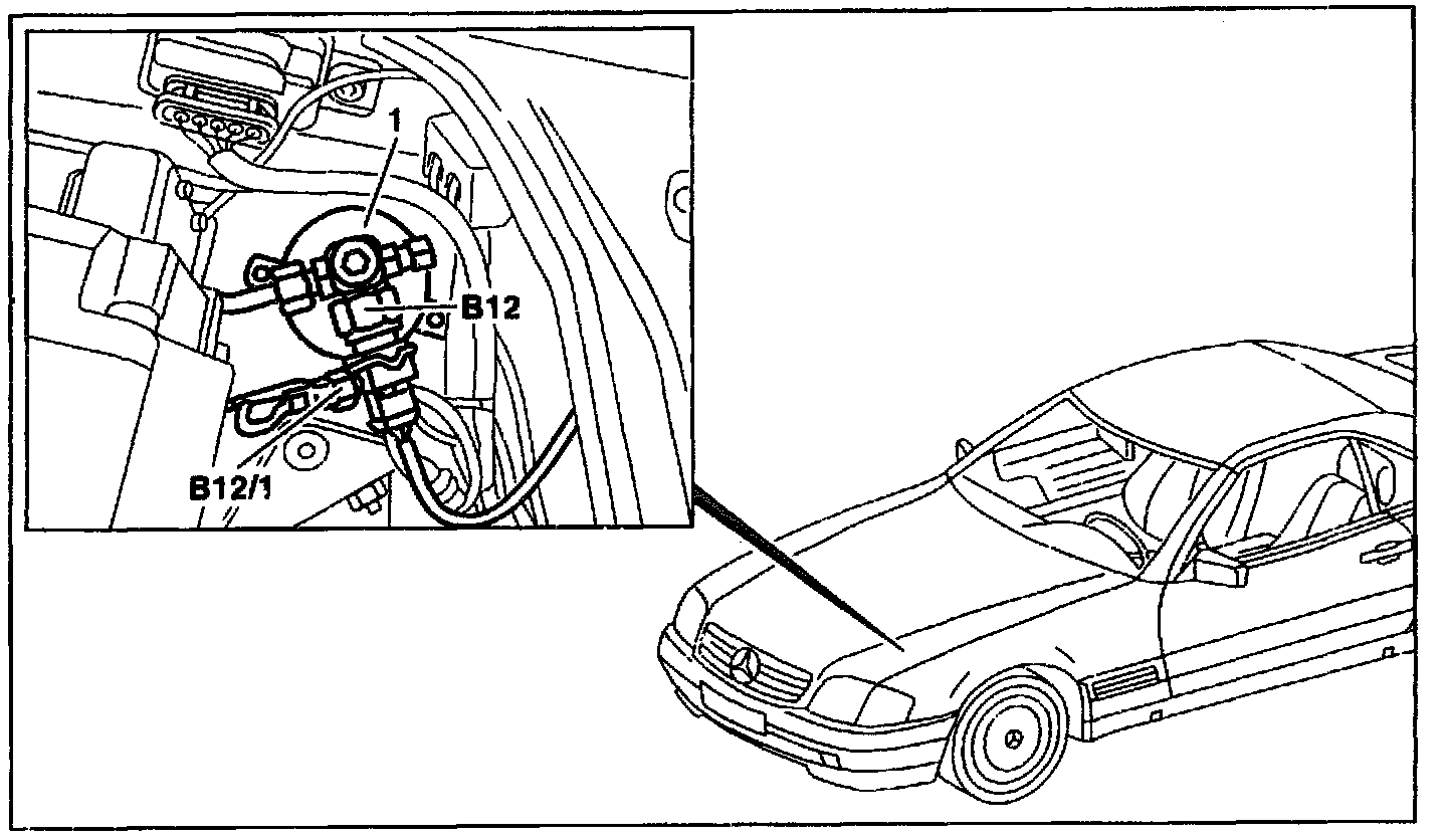 The refrigerant temperature sensor (B12/1) is located at the left front in the engine compartment and is attached to the receiver/drier (1).
