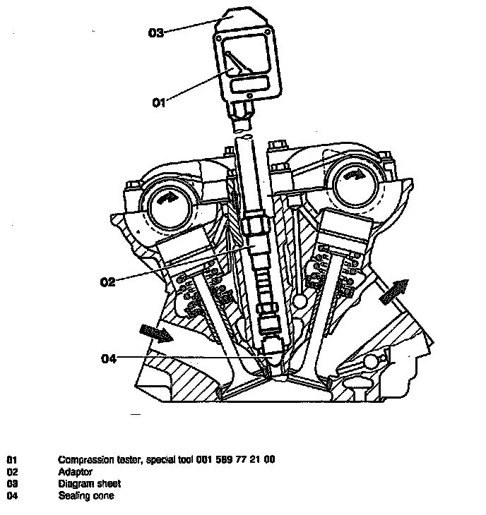 - Push compression tester (01) into spark plug hole of relevant cylinder.