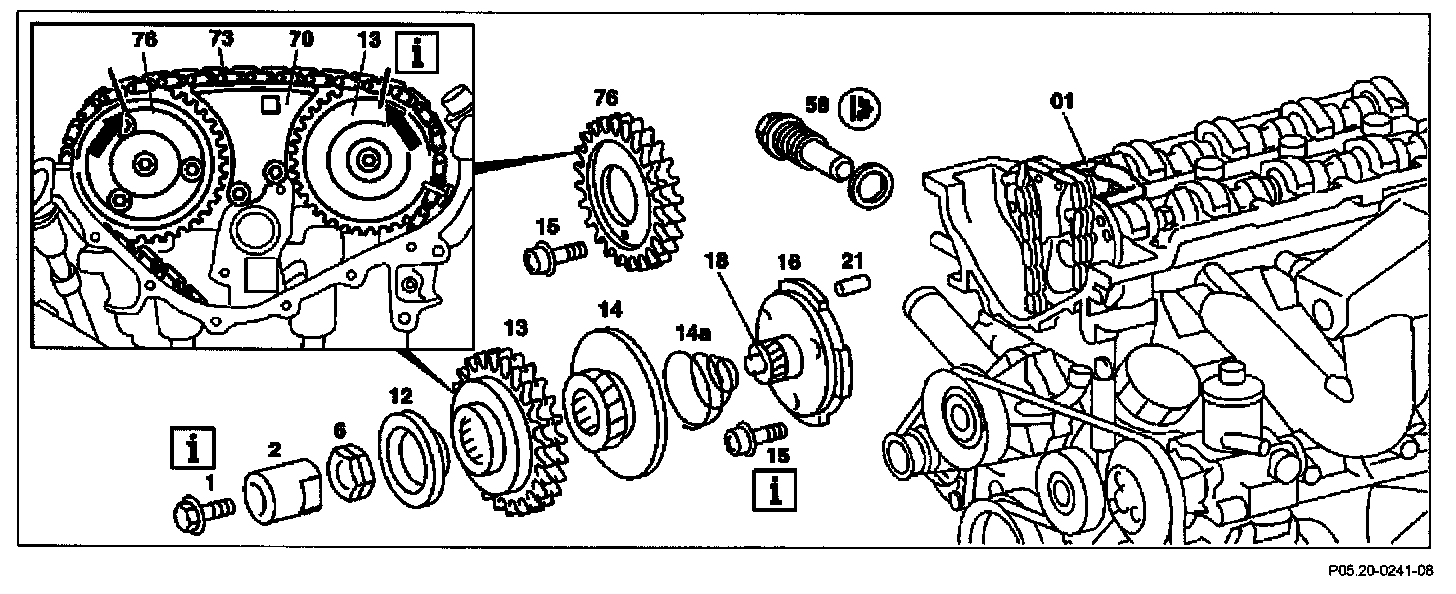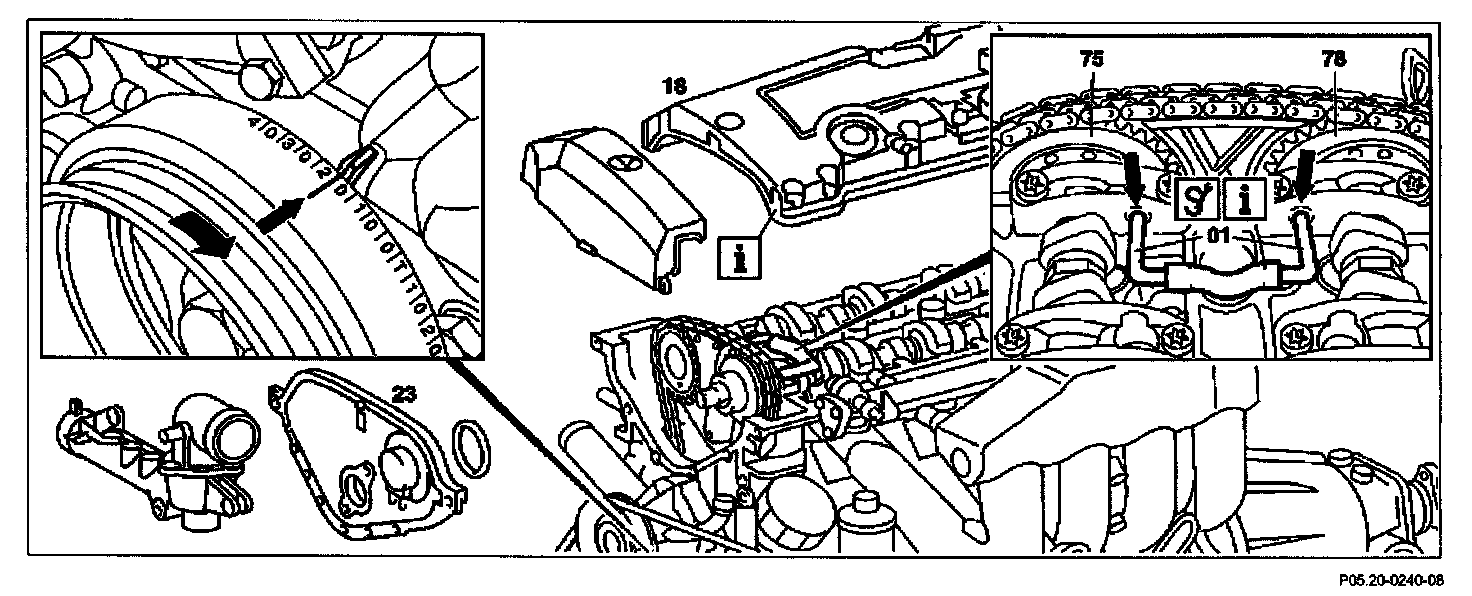 - Fit on timing chain so that the colored markings (arrows) on the timing chain and on the camshaft gears (13 and 76) are positioned one above the other.