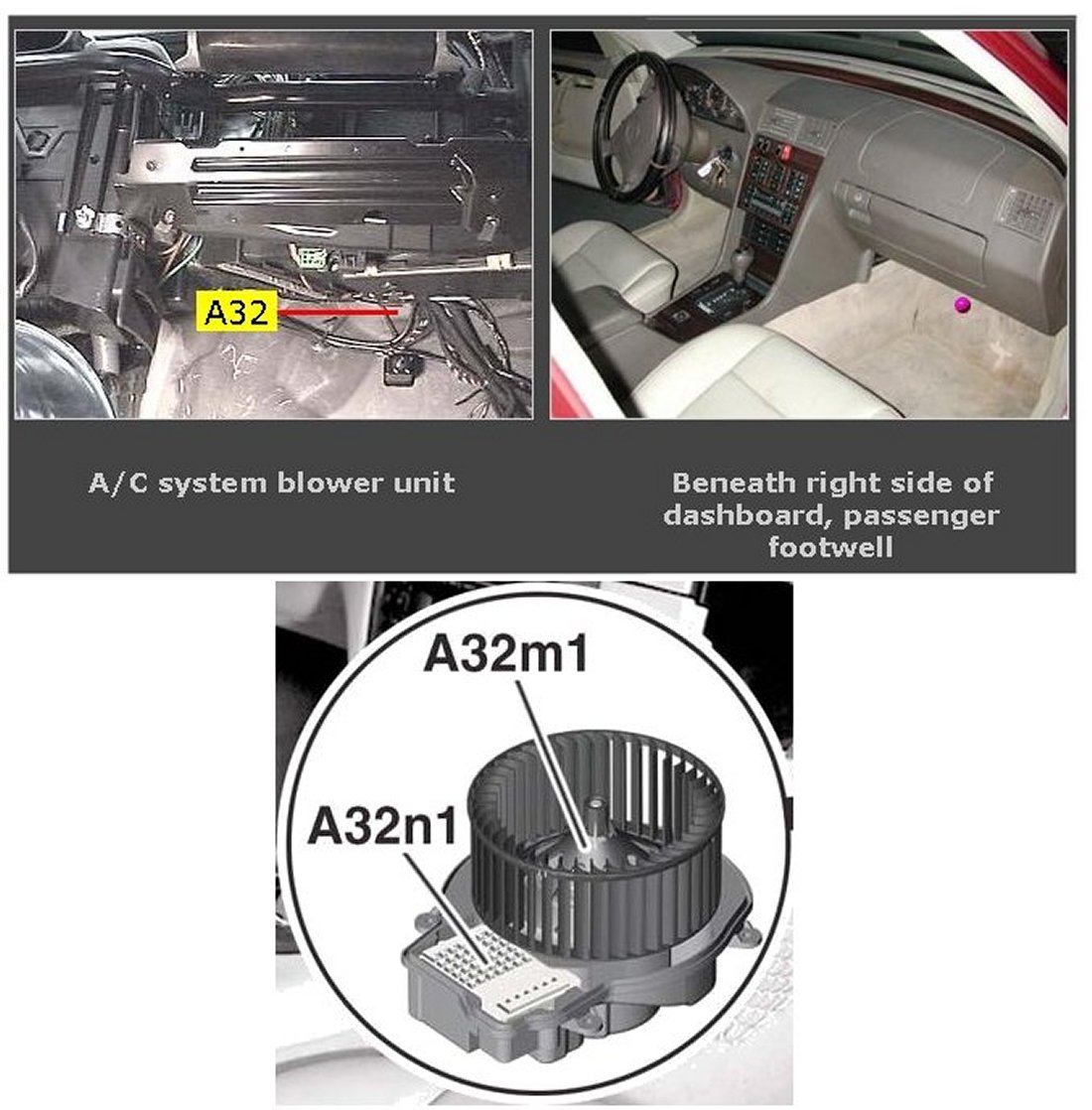 The electronic blower control (N29) is located below the glove compartment and is bolted to the blower (A32m1).