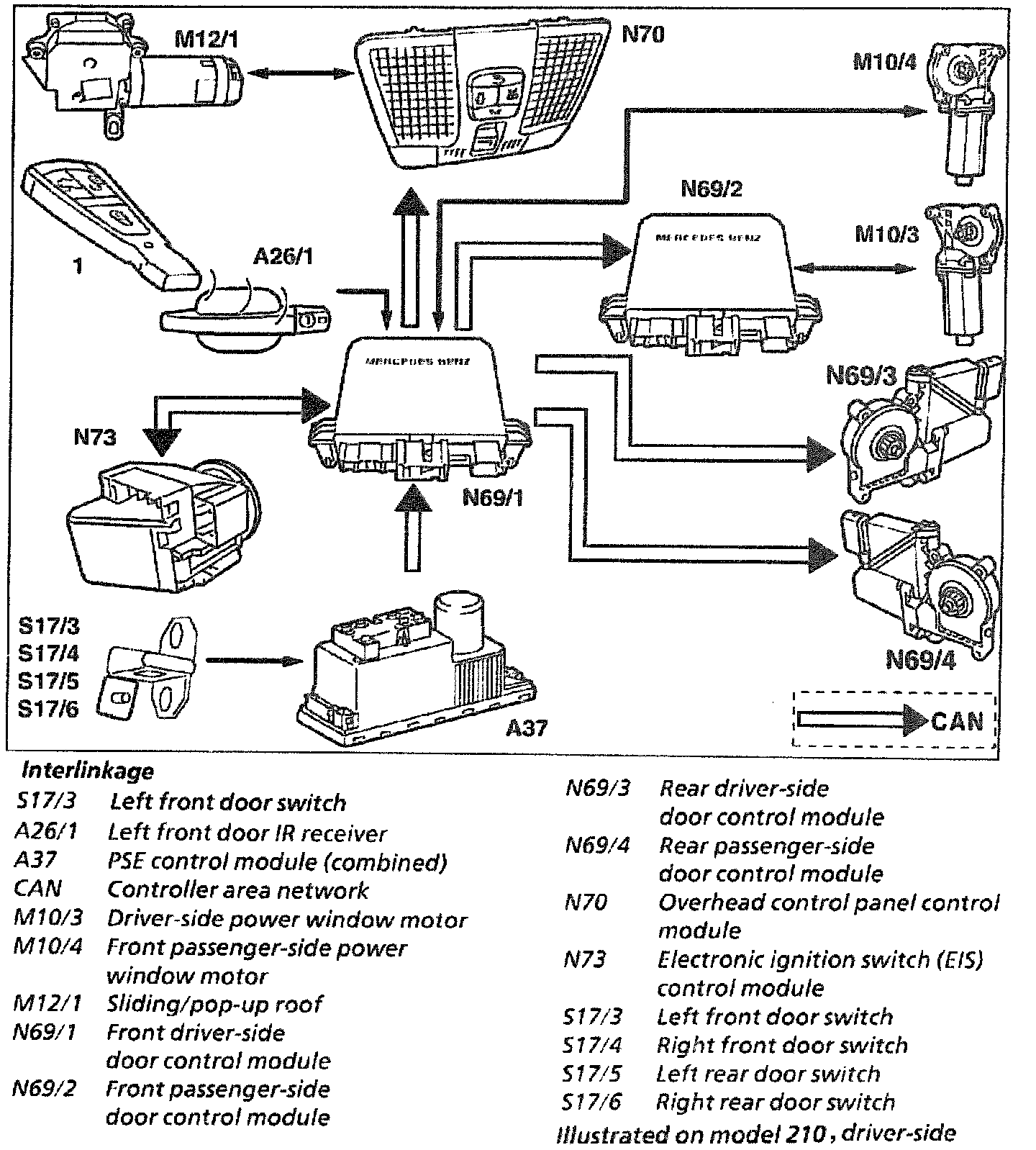 Pressing the "lock vehicle" button on the remote control key actuates the corresponding central locking function. If the button is pressed for longer than 5 seconds, the remote control key sends an infrared (IR) signal to close the windows and sliding roof with the convenience feature. This signal is received by one of the IR receivers. If the function prerequisites are fulfilled,the corresponding door control module transmits a command on the CAN bus to close the windows and sliding roof with the convenience feature. The command is transferred as long as the signal is received from the remote control key. The overhead control panel control module (N70) doses the sliding/pop-up roof with the convenience feature. The door control modules close the windows with the convenience feature.