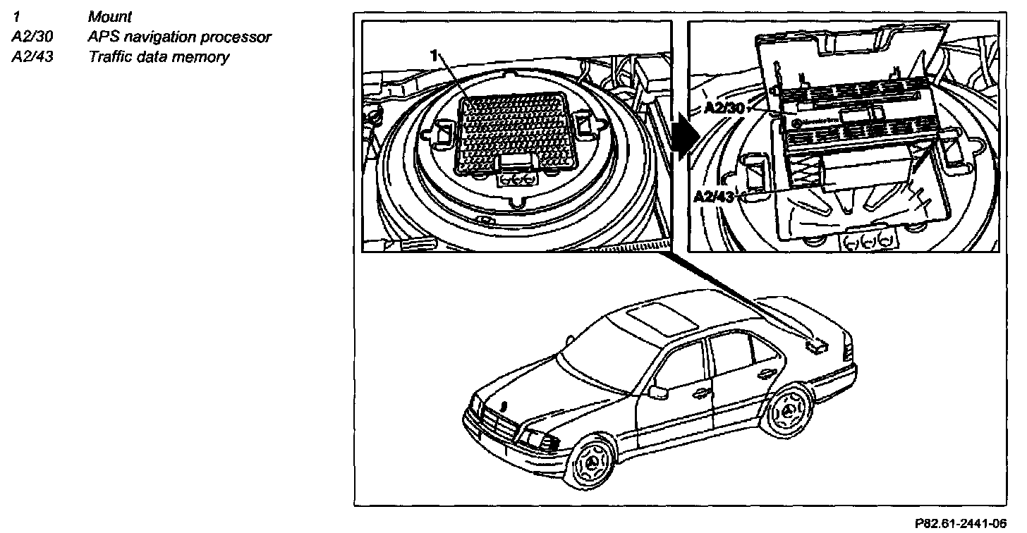 4 Remove mount (1) with APS navigation processor (A2/30) and traffic data memory (A2/43) from spare wheel recess