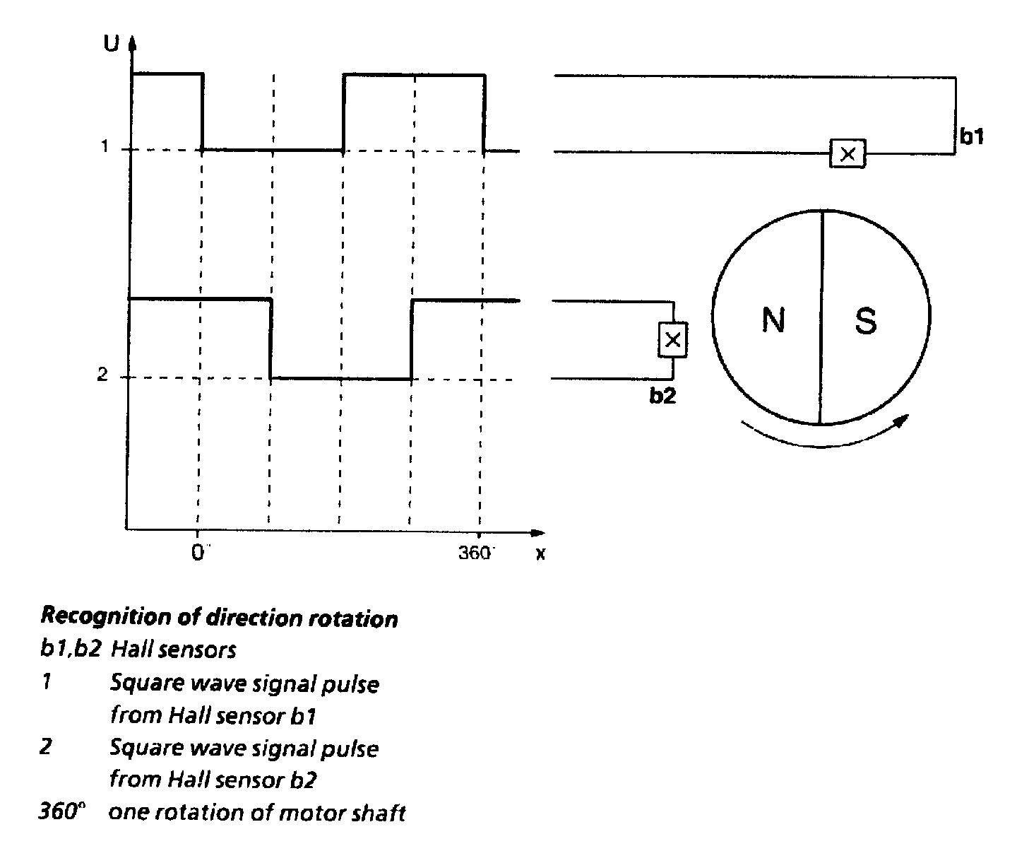 Two Hall sensors, b1 and b2 are located on the motor shaft. They react to the motion of the magnet. The Hall sensors output one square wave pulse each time the motor rotates once.