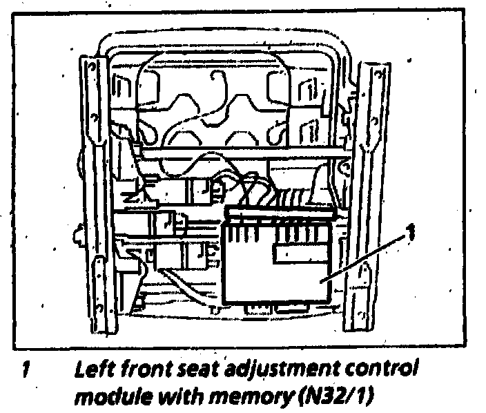 The left front seat adjustment control module with memory (N32/1) is located below the left front seat cushion.