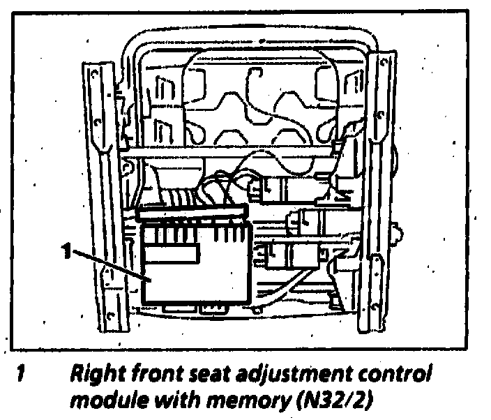 The right front seat adjustment control module with memory (N32/2) is located below the right front seat cushion.