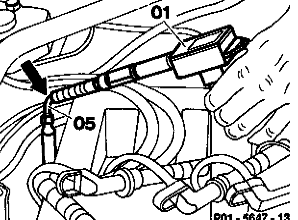 Crank several times to eliminate residues and soot (refer to Engine, Service and Repair, Cranking Engine With Starter) by pressing at contact handle of compression pressure recorder (01) in closed throttle position and parking brake applied.