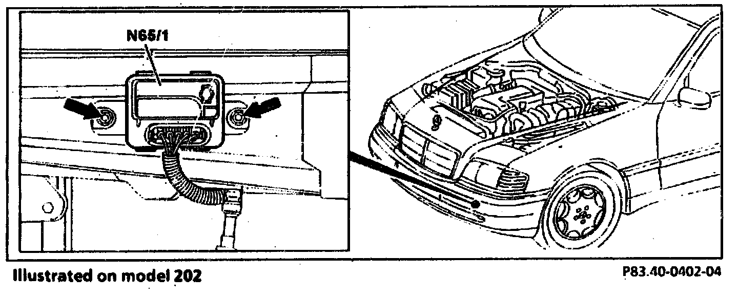 The auxiliary fan control module (N65/1) is located in the left front wheelhouse.