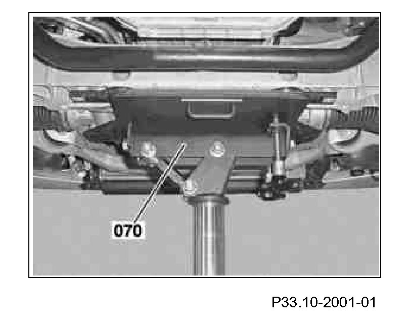 2 Attach transmission platform (070) and transmission jack to the front axle carrier and support.