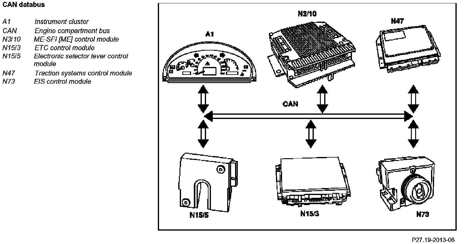 The EIS [EZS] control module (N73) forms the gateway (link) between the engine compartment bus (CAN-C) and the passenger compartment bus (Can-B). The ETC control module EGS (N15/3) receives the following input signal via the EIS [EZS] control module (N73) from the AAC pushbutton control module (N22):