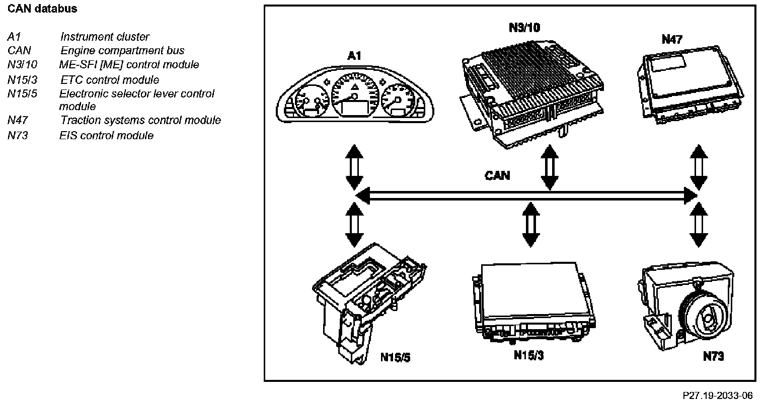 The EIS (N73) forms the gateway (link) between the engine compartment bus (CAN-C) and the passenger compartment bus (CAN- B). The ETC transmission control module EGS (N15/3) receives the following input signal via the EIS [EZS] control module (N73) from the AAC pushbutton control module (N22):