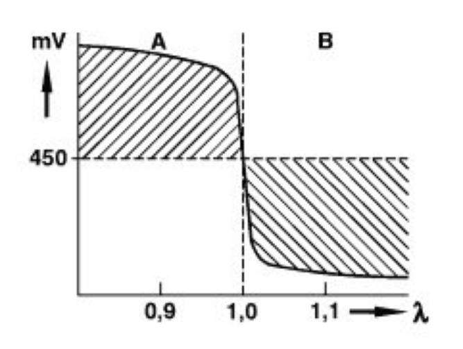 The O2 sensor signal has a steep voltage jump (at lambda=1) at the transition from a rich (A) to a lean mixture (B). This property is utilized for the lambda closed-loop control.