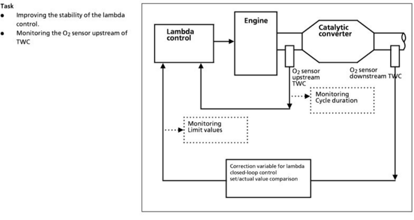 The engine control unit calculates the lambda mean value from the signals supplied by the oxygen sensor downstream of TWC. This value is compared with a stored value for optimum exhaust emissions.