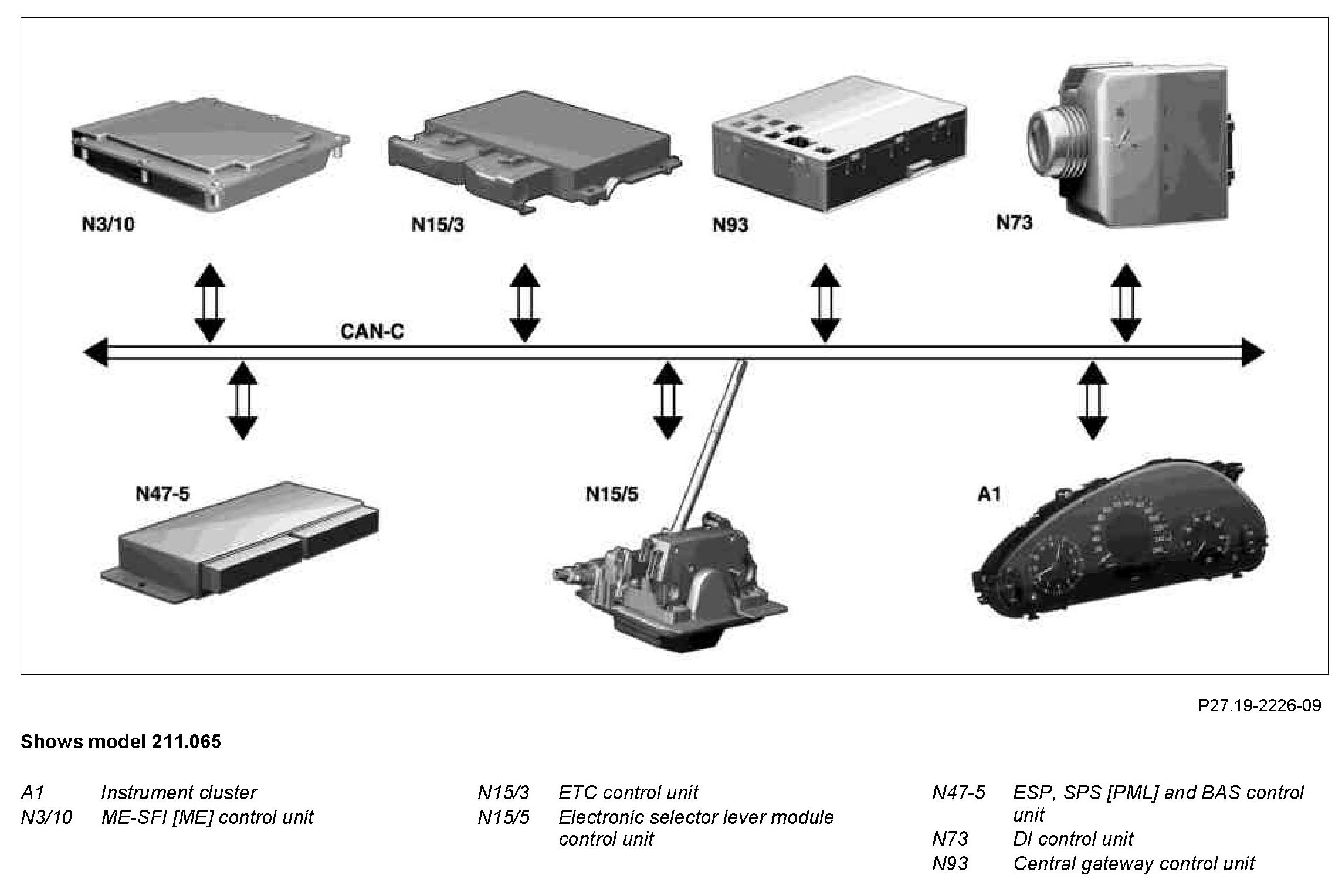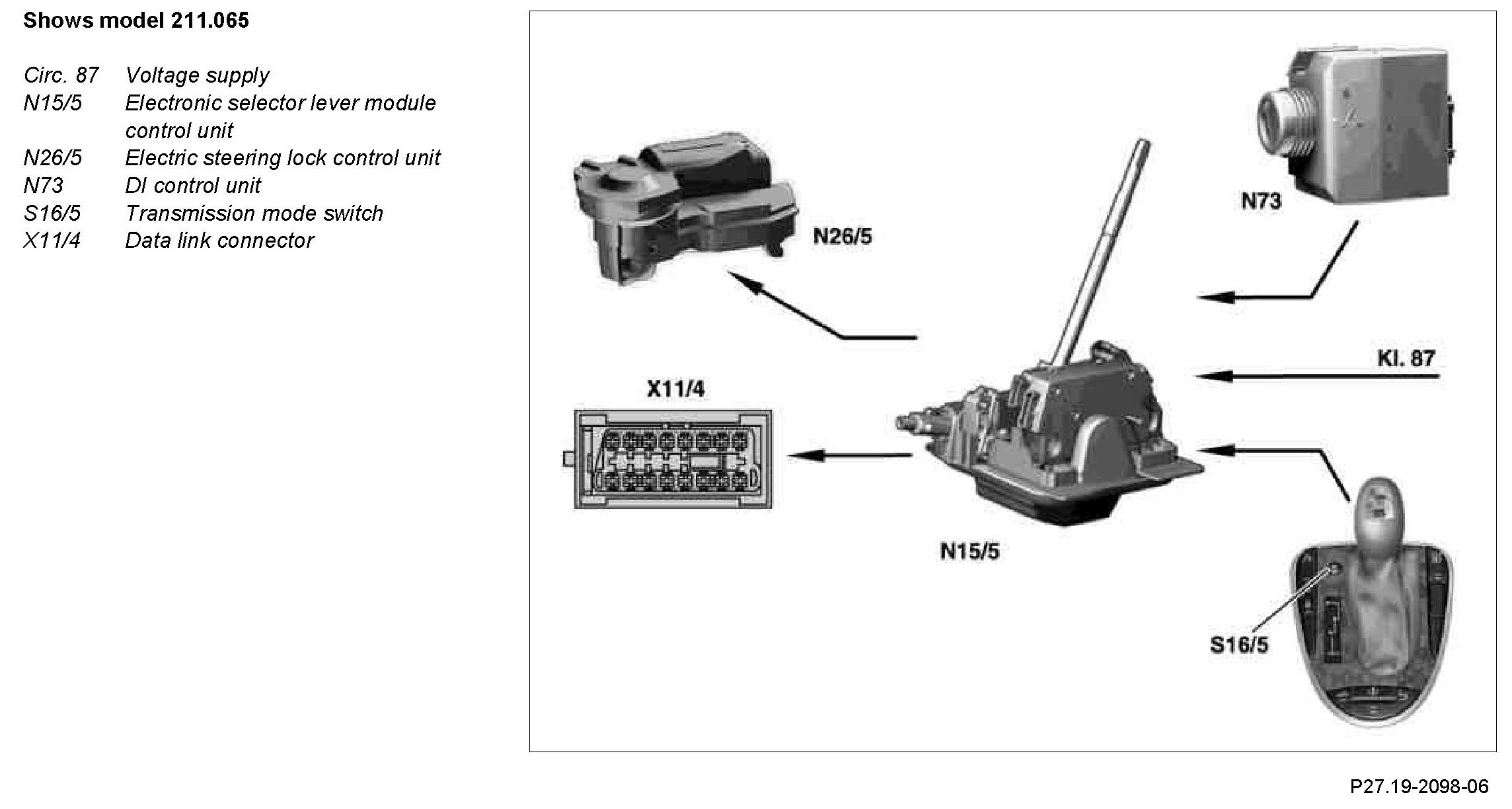 The electronic selector lever module control unit (N15/5) receives digital and analog input signals, actuates various components or transmits information to various control units via the Controller Area Network bus class C (engine compartment) (CAN-C). The selector lever positions and touch shifts carried out are detected in a non-contact manner by means of optoelectronic switches. A photoelectric barrier is closed or interrupted each time the position of the selector lever is changed.