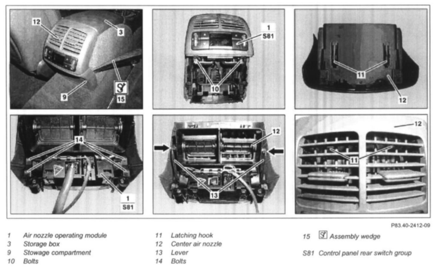 13.2 Unscrew screws (14) and remove the control panel rear switch group (S81) from the center air nozzle (12)