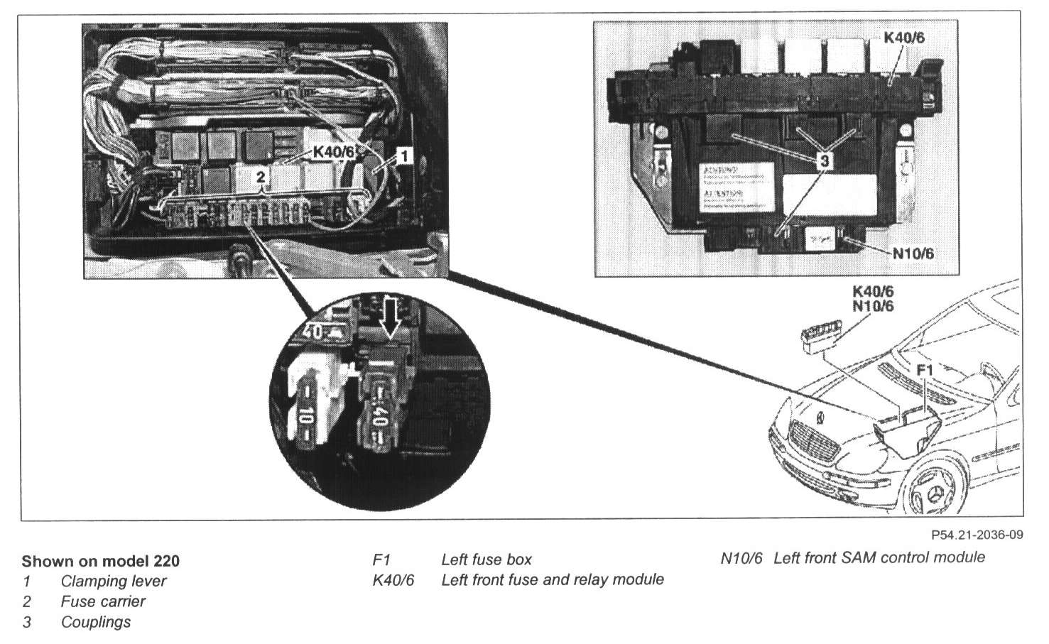 6 Unclip fuse carrier (2) on control module unit (driver-side SAM control module (N10/6) with left front fuse and relay module (K40/6)).