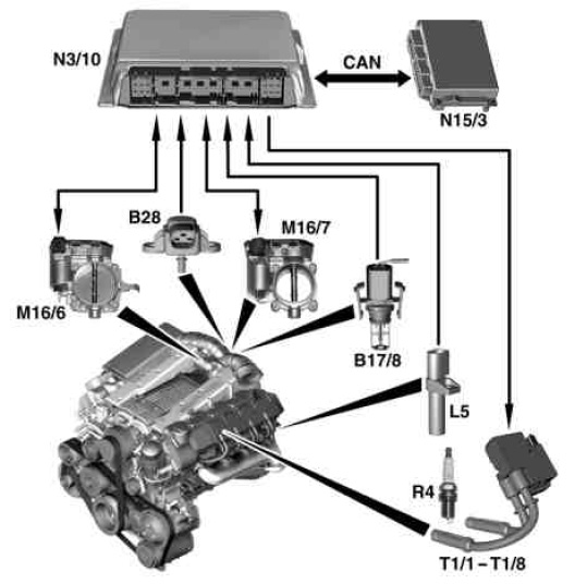 The ME control unit controls in line with the performance map, if altering the ignition angle is sufficient or if the throttle valve and recirculated air flap must be retarded.