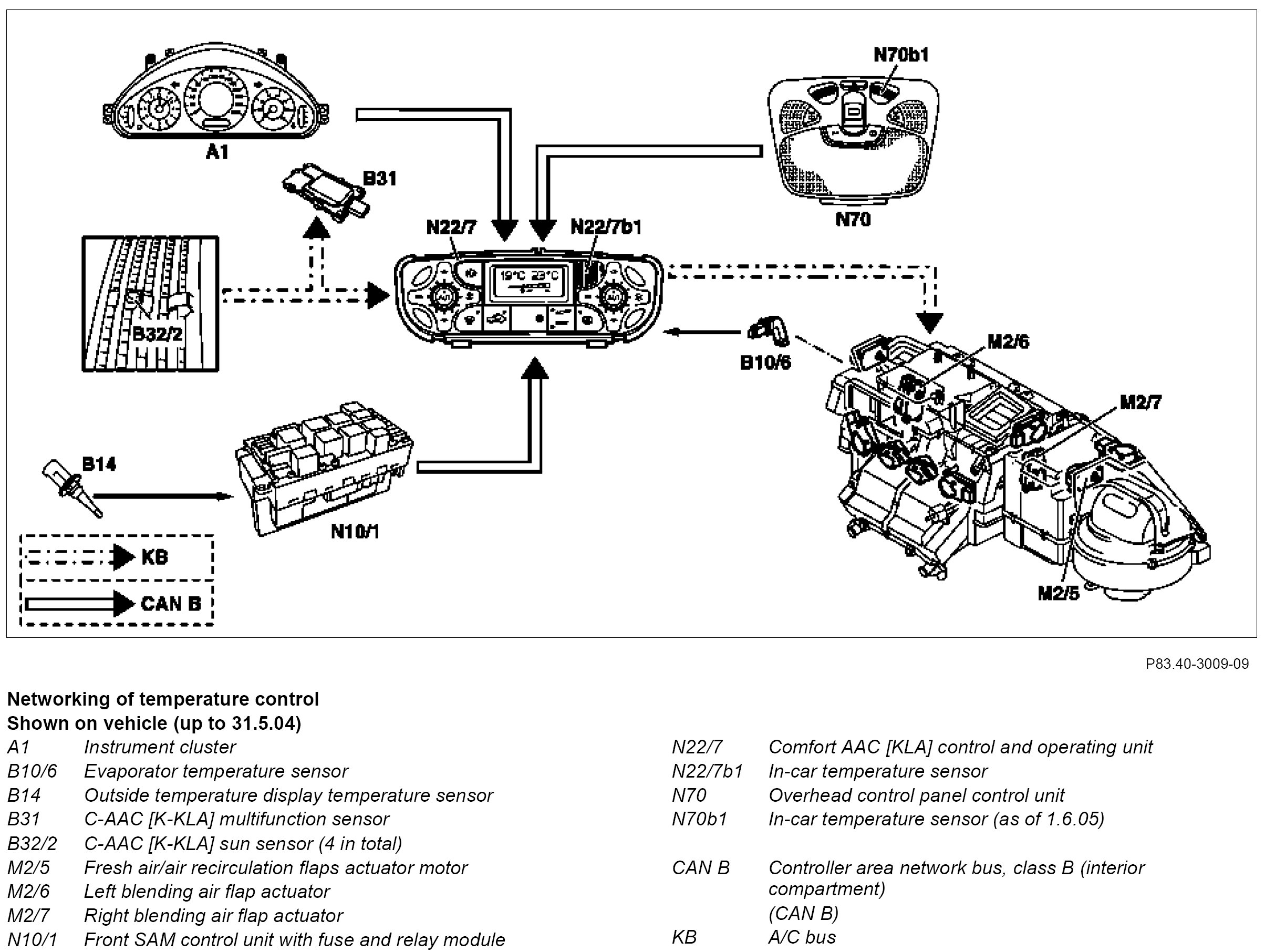 The evaporator temperature sensor (B10/6) measures the air temperature at the air outlet of the evaporator, while the in-car temperature sensor (N22/7b1) in the comfort AAC [KLA] control and operating unit (N22/7) and the in-car temperature sensor (N70b1) (as of 1.6.05) in the overhead control panel control unit (N70) determine the particular interior temperature. In addition the outside temperature is also determined by the outside temperature indicator temperature sensor (B14), the humidity is determined by the C-AAC multifunction sensor (B31) and the intensity and direction of the solar radiation is determined by the C-AAC sun sensor (4 sensors in total) (B32/2).