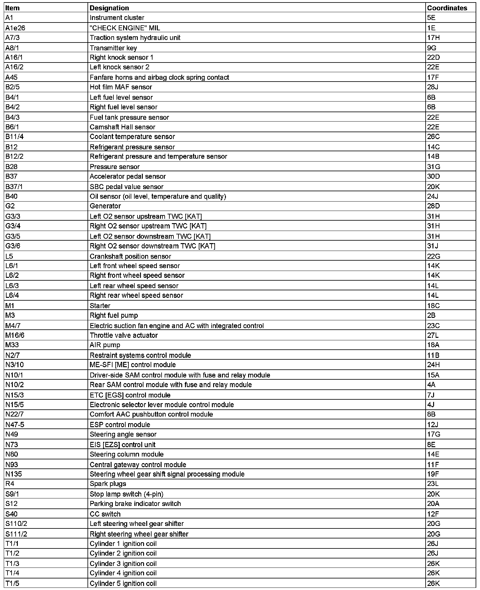 Component Description/Coordinates, A1 To T1/5: