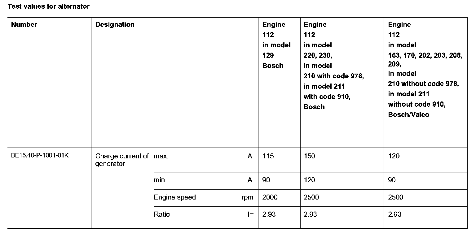 Test values for alternator: