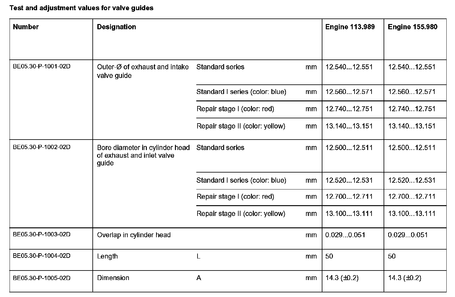 Test and adjustment values for valve guides: