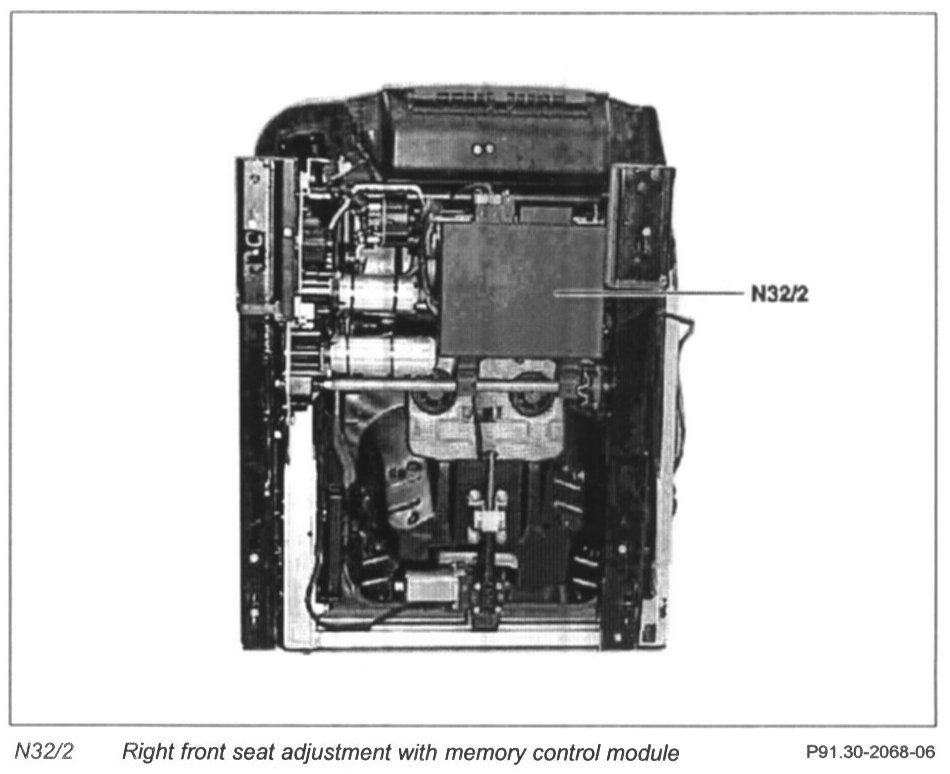 The right front seat adjustment with memory control module (N32/2) is located below the front passenger seat.
