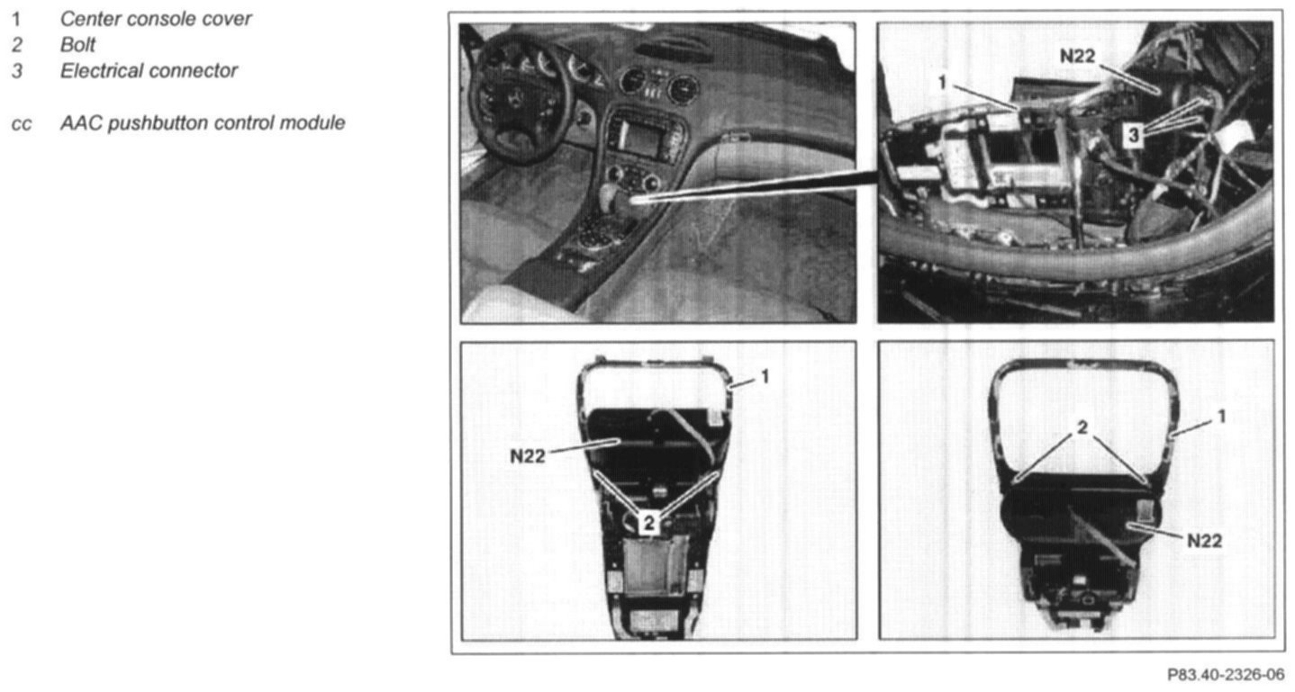 4 Unscrew screws (2) and remove the AAC pushbutton control module (N22) from the center console cover (1)
