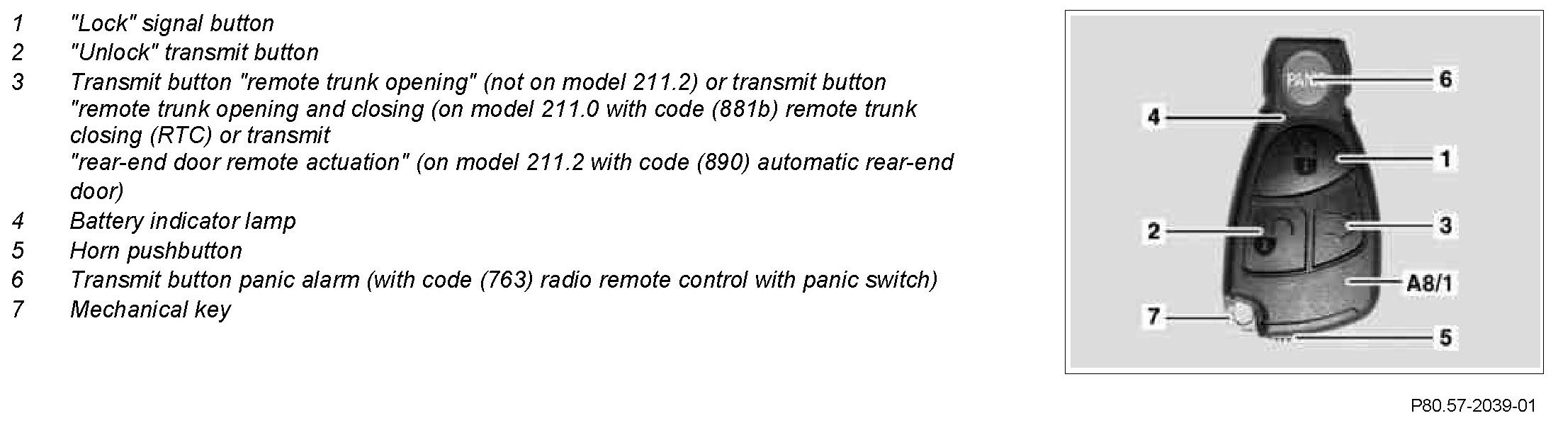 The transmitter key (A8/1) consists of an electronic key and a mechanical key (7). The electronic key includes an FM radio transmitter, an infrared transmitter/receiver, a computer chip and control buttons as well as two button cells. The mechanical key (7) can be unlocked and removed with the pushbutton (5).