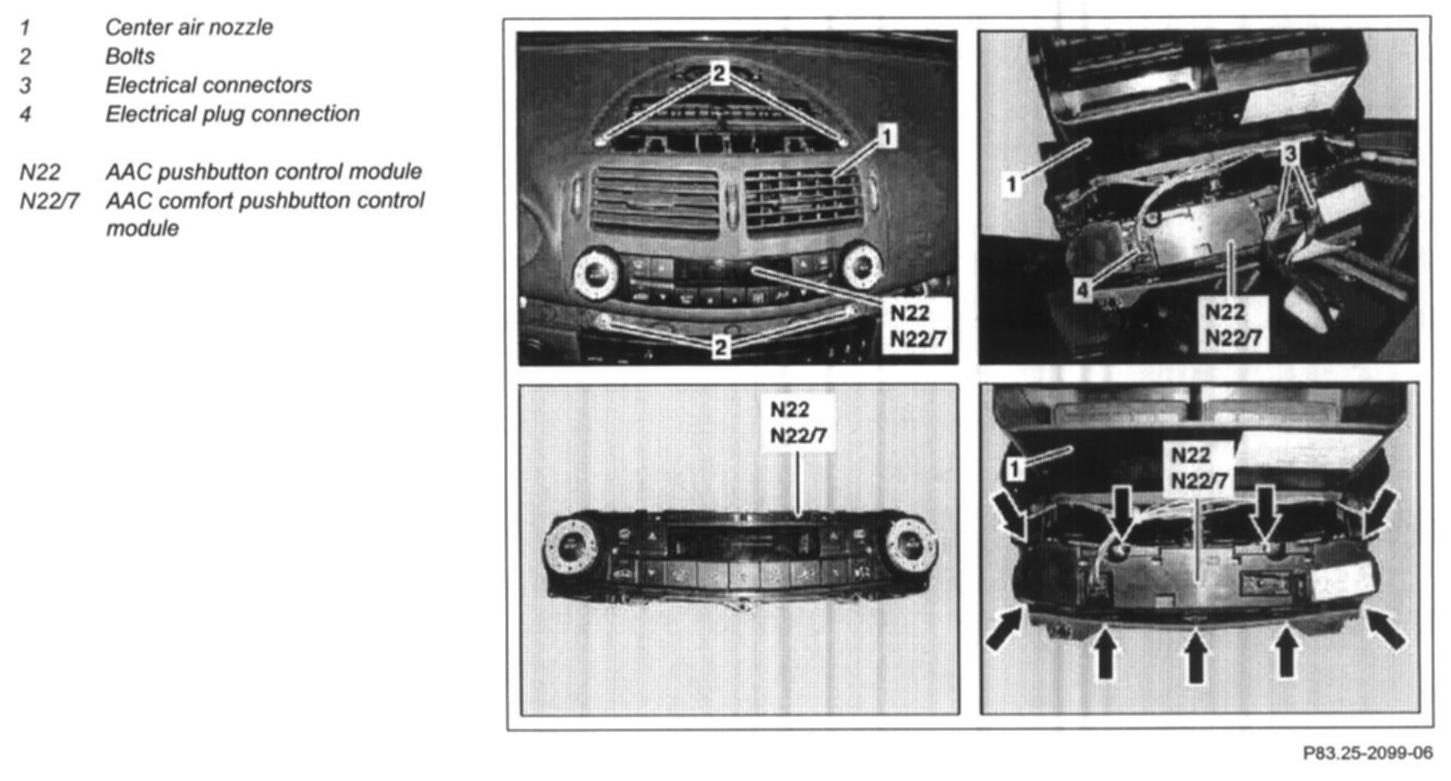 7.1 Remove the AAC control and operating module (N22) from the center air nozzle (1)