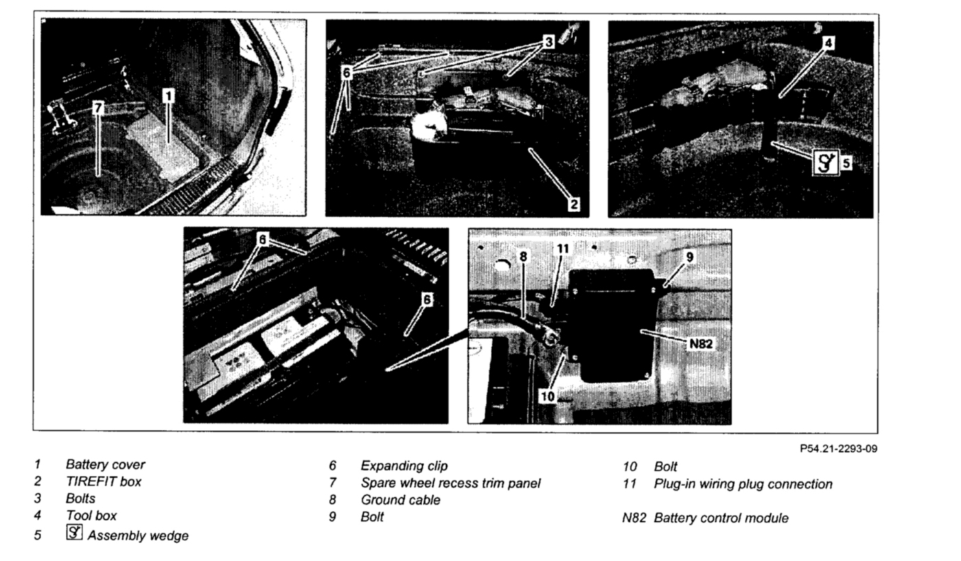 9 Raise spare wheel recess trim panel (7) until battery control module (N82) can be accessed